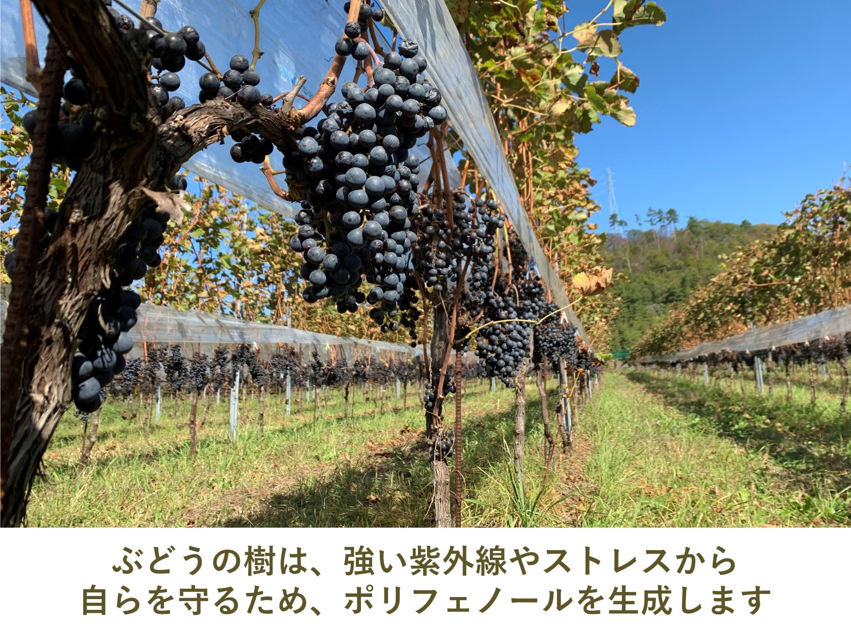 それでも諦めきれず、個人的に各地のワイン用ぶどう畑から、様々な品種、剪定時期の違い、部位の違いなど、原料の開発研究を続けていたところ、長野県上田市の Sail the Ship Vineyard の副産物から他よりも圧倒的に高い濃度のレスベラトロールを含む独自原料の抽出に成功!