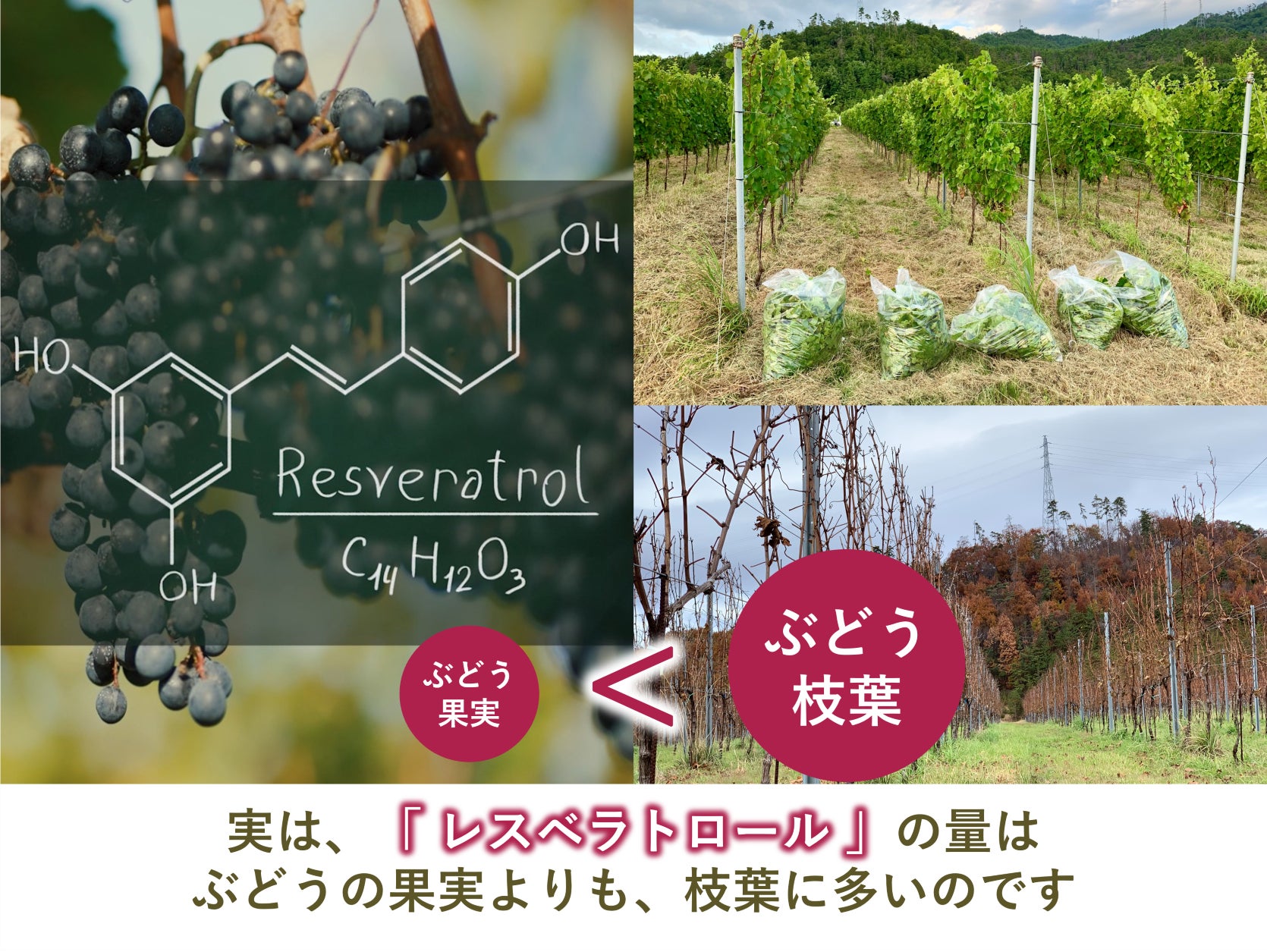 ワイン用ぶどうの生産過程で普段は棄てられ燃やされている副産物に着目して美容成分を抽出、高濃度のレスベラトロールを含有する※「ブドウつるエキス」の開発に成功しました。
