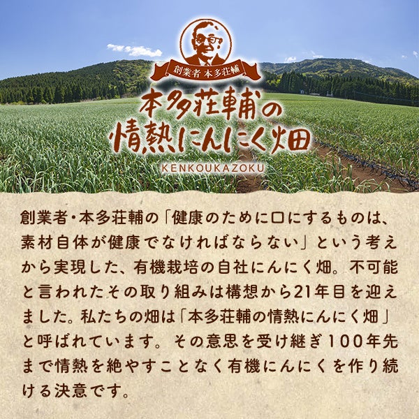 健康家族は創業から46年間、安心・安全に一切の妥協をすることなく商品を作り続ける。創業者・本多荘輔の「健康のために口にするものは、素材自体が健康でなければならない」という信念を頑なに守り続けているのだ。素材となるにんにくは病気に弱く、専門家の間でも農薬や化学肥料を使わずに大規模な栽培をするのは不可能と言われていた。「それなら自分たちで作るしかない」と有機でのにんにく栽培に情熱と愛情を注ぎ、荘輔が人生をかけて生み出したのがオリジナルブランド「にんにく王」である。にんにく特有の有用成分「GSAC」は、外国産と比較して3倍も多い。その中でも「GSAC」が格段に高いにんにくを厳選して「伝統にんにく卵黄 極」に使用している。それによって、たった「1日1粒」で活力実感を叶えた。