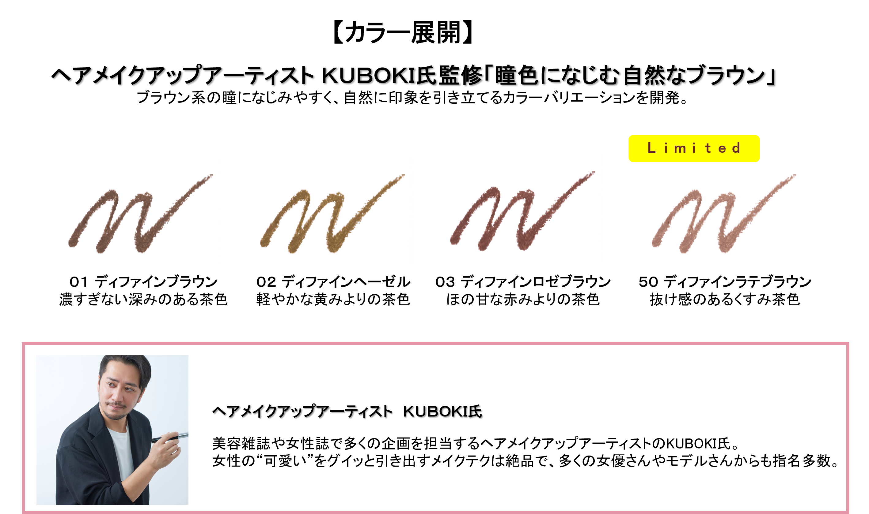 ヘアメイクアップアーティスト KUBOKI氏監修の4色から、瞳の色に合わせて選べます。