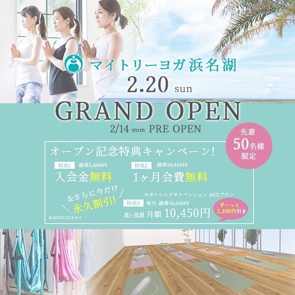 2022 年 2 月 20 日(日)静岡県湖西市に 3 店舗目となる『マイトリーヨガ浜名湖店』グランドオー プン。