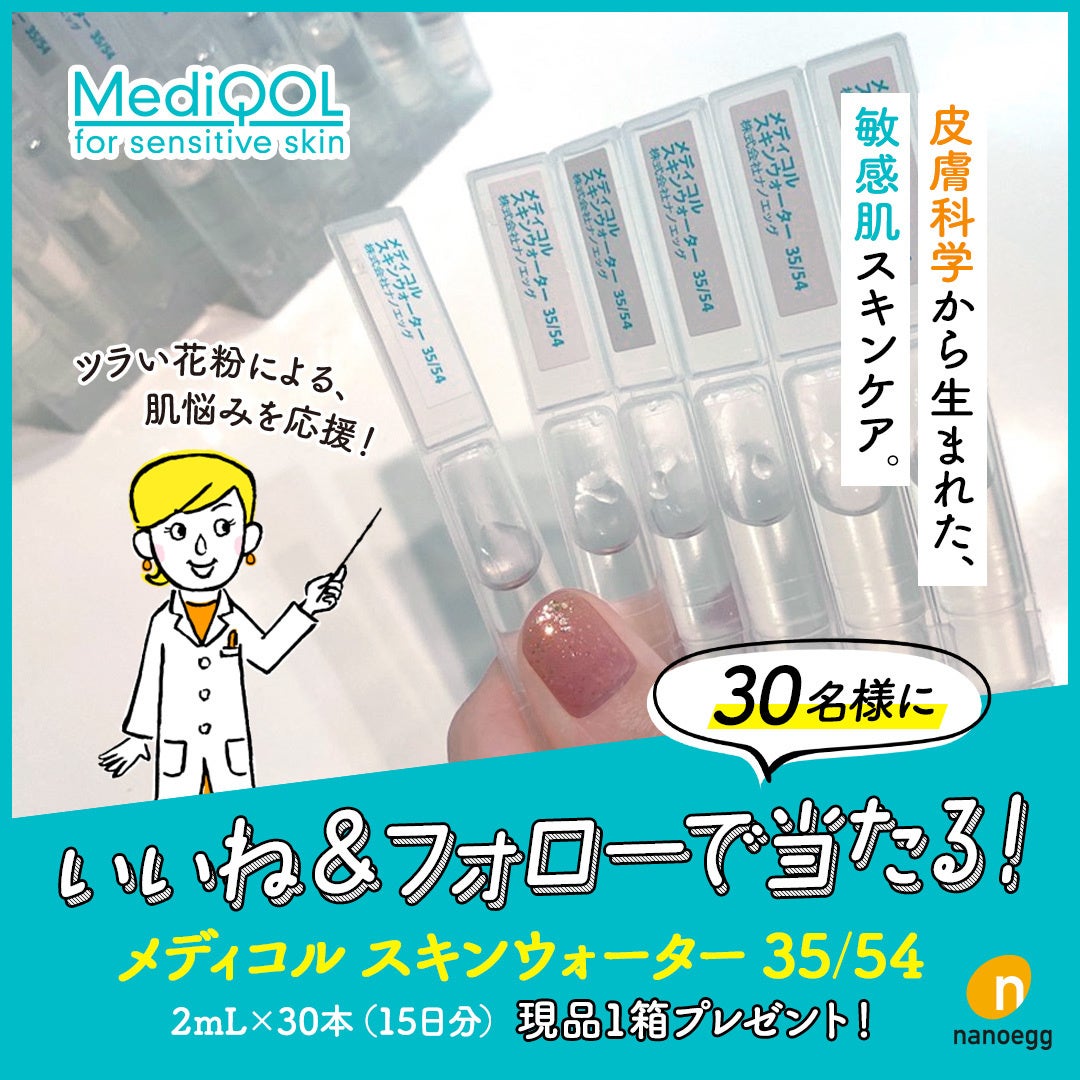 ツライ花粉の季節にも負けない肌を作るスキンケア対策として、ナノエッグの敏感肌スキンケアシリーズ「MediQOL(メディコル)」から「メディコル スキンウォーター 35/54(現品)」を抽選で30名様にプレゼントいたします。