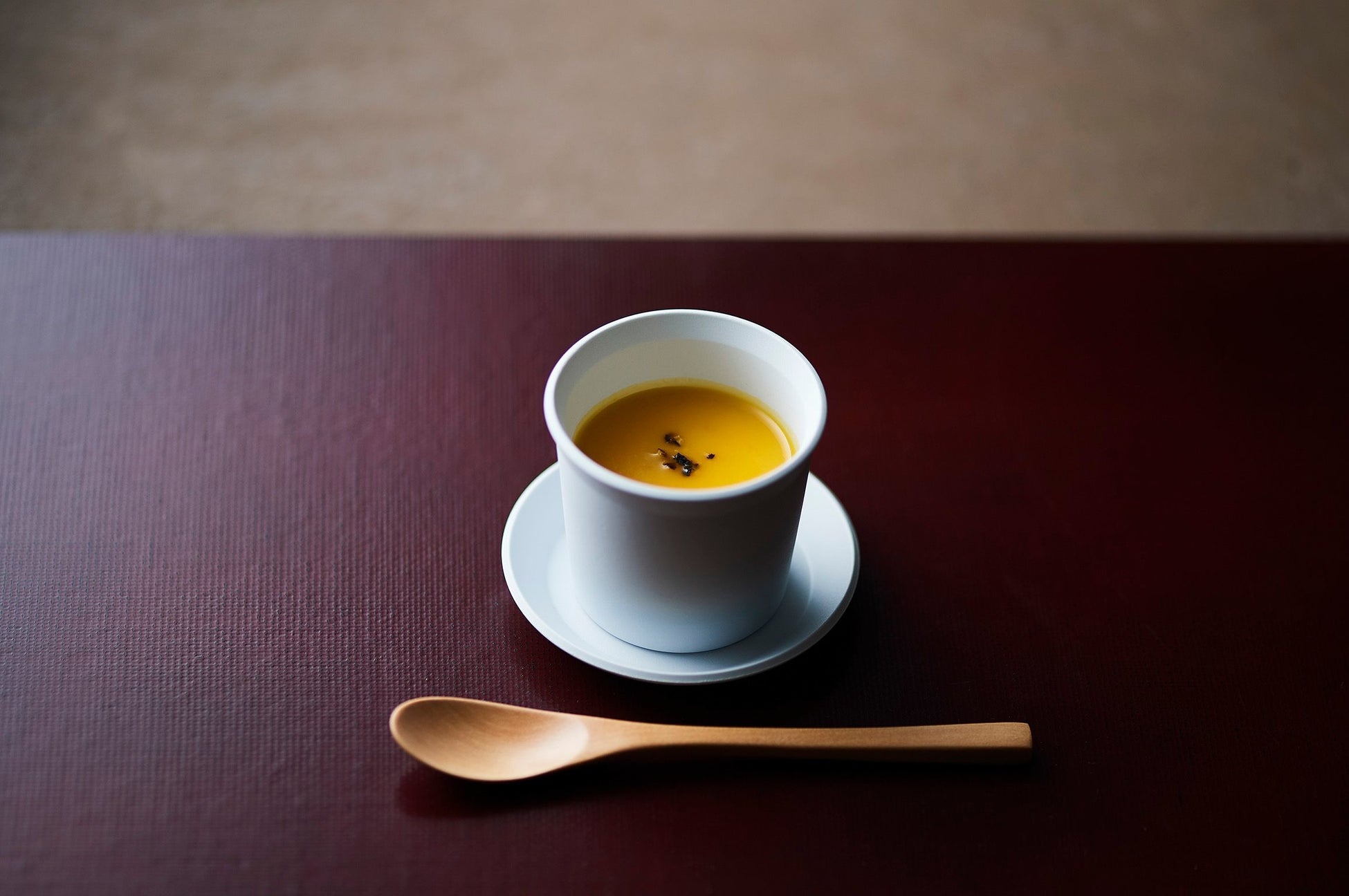最初の「季節のすりながし」は、その時期に一番美味し い野菜とブラウンライスの基本出汁である昆布出汁を 使って身体を温め、食欲を刺激する一品です。