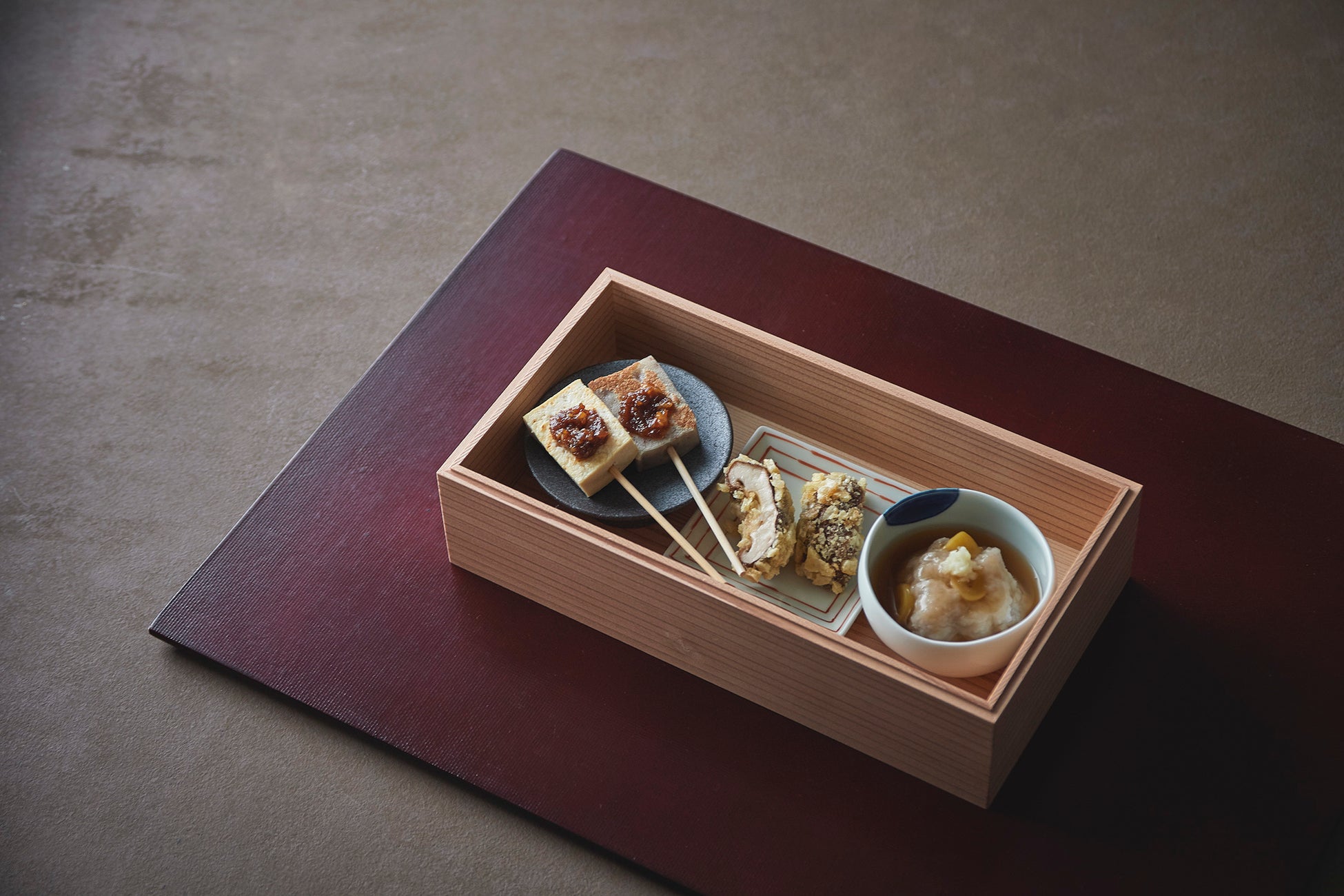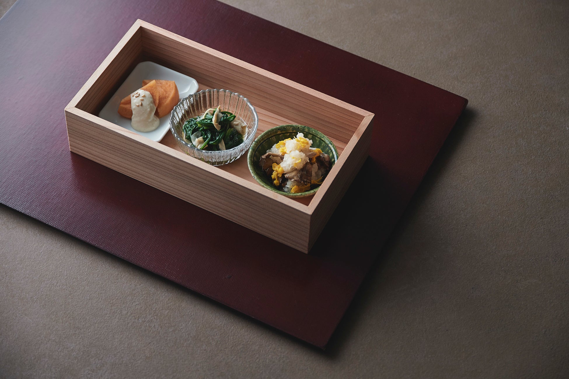 その後、3 種の和え物の一の膳が提供されます。 和え物は和食の五法の中でも「生食」の方法としてバラ エティ豊かな食べ方提案が可能な調理法であり、ブラ ウンライスでは「季節のフルーツの白和え」や「和え物 の湯葉巻き」、辛味のある大根おろしであえる「みぞれ 和え」などを採用しています。