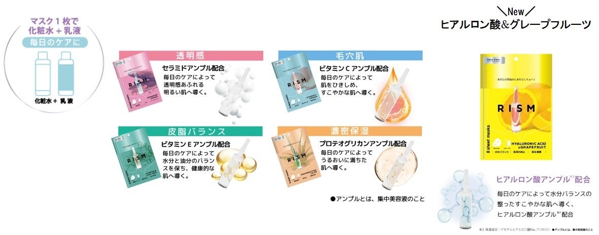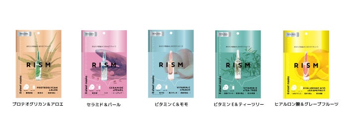 「RISM(リズム)」は、洗顔後シートマスクをするだけでスキンケアが完了することを目指したオールインワンタイプで気軽に使える8枚入りの「デイリーケアマスク 各715円(税込)」、より深い集中保湿を叶える1枚入りの「ディープケアマスク 各198円(税込)」の2シリーズを展開しています。2020年11月の発売以来、幅広い年齢層の女性にご愛用いただき、累計出荷数量が160万枚※を超える人気アイテムに急成長。単に時短ケアを叶えるだけでなく、全商品に、乾燥などの外部刺激や不規則な生活の影響を受けやすい現代人の肌コンディションを整える美容成分「クロノシャルディ(ブドウ果実エキス)」を配合。加えて、日々変化しやすい肌悩みにあわせたコンセプト成分を配合。マスクの長時間着用による肌のトラブル、季節の変わり目や外的要因、年齢を重ねるにつれて変化するさまざまな肌悩みに合わせ、アプローチできるラインナップとなっています。今回追加される新商品は、水分バランスを整えすこやかな肌へ導く「デイリーケアマスク ヒアルロン酸&グレープフルーツ」と、なめらかな肌触りに着目した「ディープケアマスク ハニー」の2アイテム。また、「RISM(リズム)」のシートマスクは、すべて肌にやさしい100%植物性シートを採用。化学接着剤を使用せず、水だけで織ったシートは、衛生的で肌への負担が少ない使い心地のよいシートです。