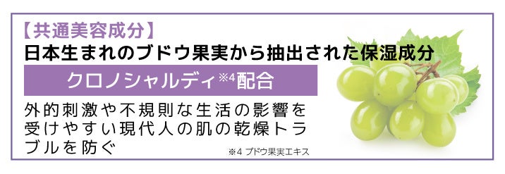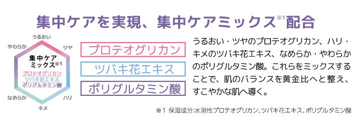 ※1:集中美容液のこと ※2:保湿成分:水溶性プロテオグリカン、ツバキ花エキス、ポリグルタミン酸 ※3: 保湿成分:ブドウ果実エキス