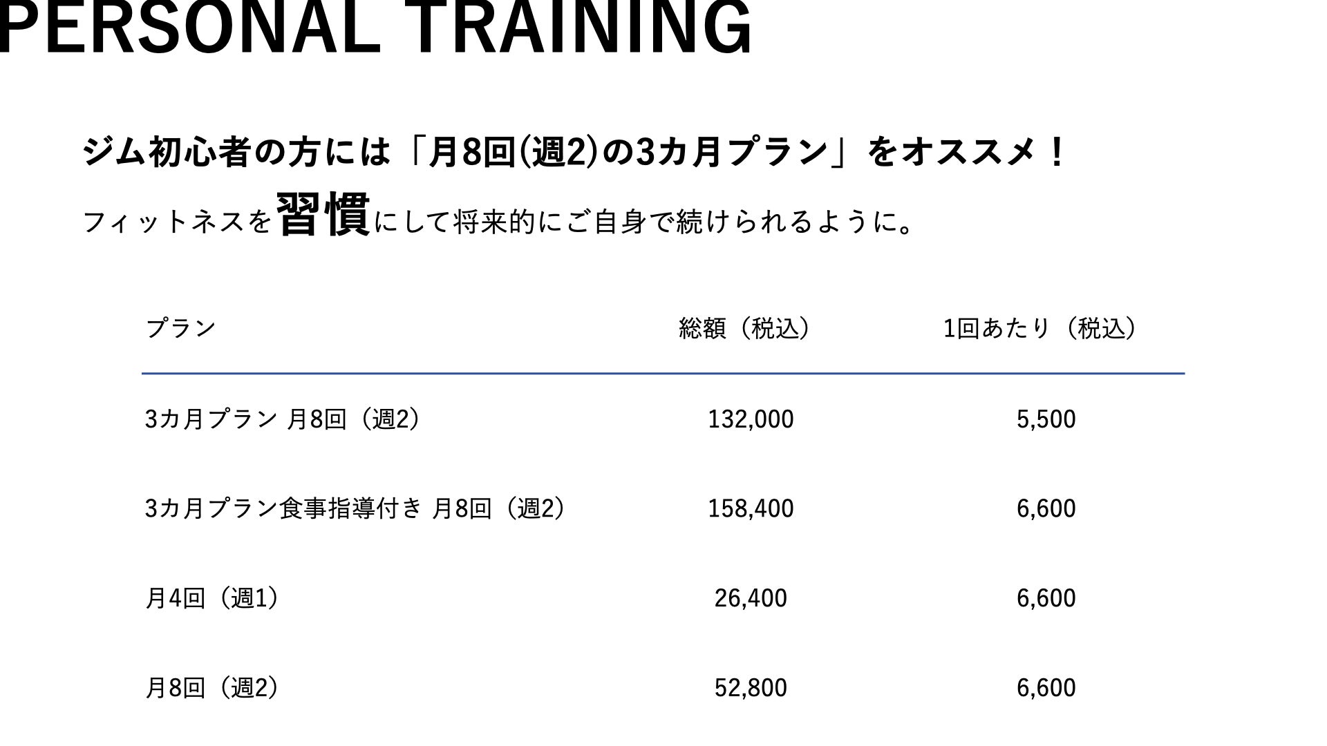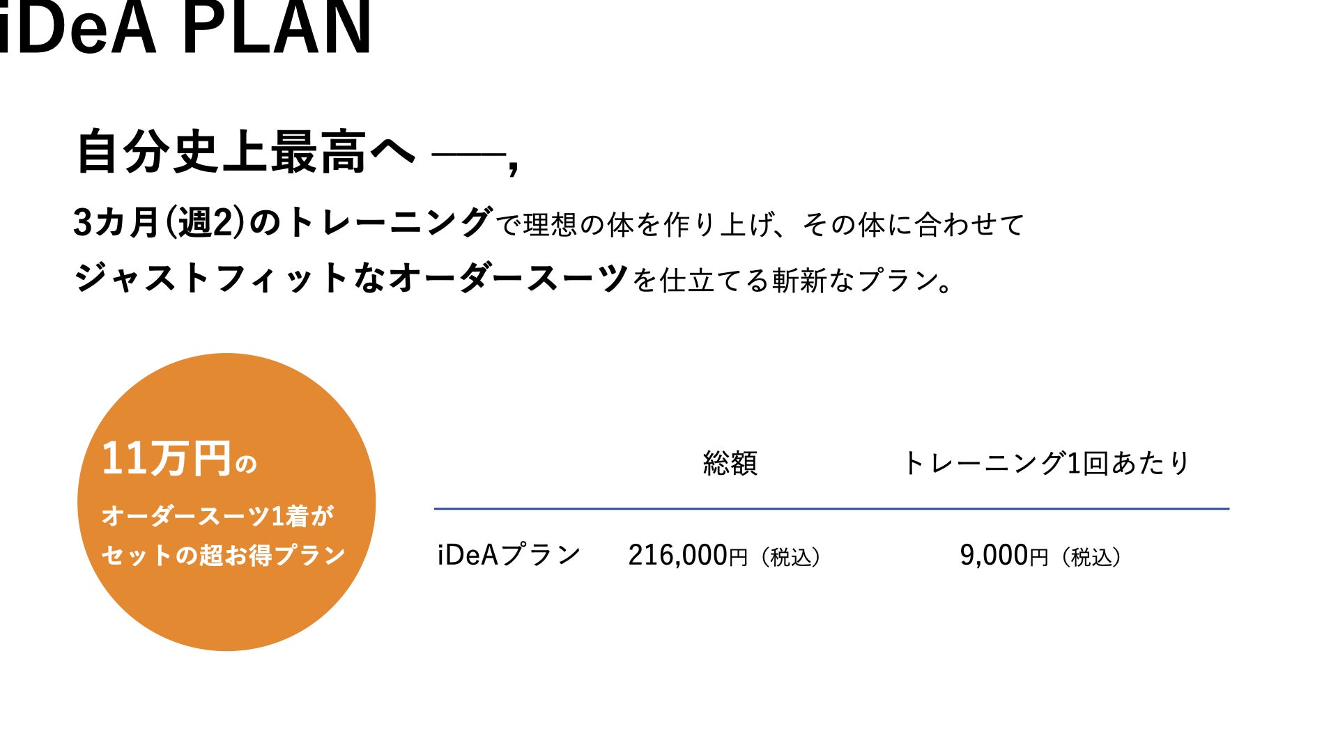 パーソナルトレーニング3カ月間(月8回、週2)に加えて、オーダースーツ1着(インポート生地、通常販売は11万円)がセットになった月額72,000円(総額216,000円)のお得プランです。「健康でメリハリのある体作り」、「魅力的で説得力のある装い」を求めるビジネスパーソンやエグゼクティブ層に対して、中身と外見を全面的にサポートするサービスが登場しました。3ヶ月間パートナーとして関係性を築くからこそ、理想の体、そして理想の1着を実現することが出来ます。