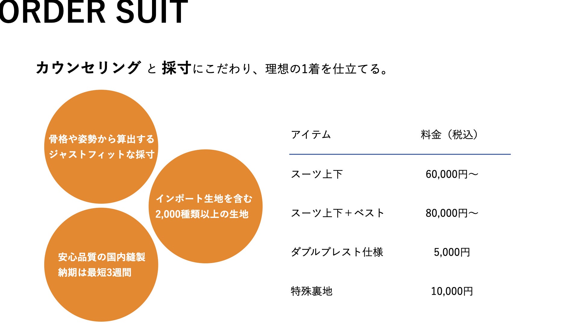 カウンセリングの時間を最も大切にし、生活習慣、職業、持たれたい印象などに合わせてお客様の理想を実現するデザインを提案いたします。パーソナルで何百人もの体をサポートし、解剖学を熟知しているからこそ、姿勢や骨格まで見据えたジャストフィットな採寸が可能です。インポートを含めた2,000種類以上の生地を取り扱い、国内にて縫製しております。全国への出張採寸も実施しています。