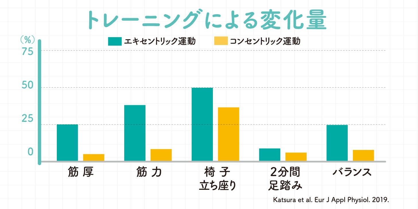 エキセントリック運動を継続的に行っていくことによって、筋力、筋持久力、パワーが向上し、歩行能力やバランス能力も向上します。