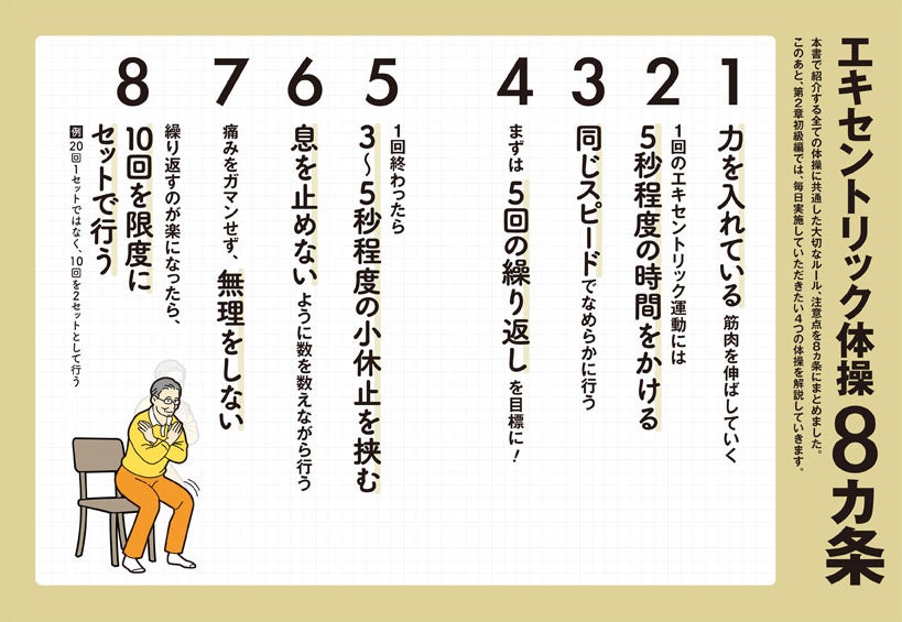 この本に紹介されている体操は、毎日行って良いものばかりです。第2章初級編で紹介している椅子座りやかかと下げ、胸伸ばし、お腹伸ばし、4つの体操を1日5〜10回、毎日行うことができれば理想的です。特別な機器や道具がなくても1人で実施可能な体操ばかりですので、可能であれば無理のない範囲で第3章中級編、第4章上級編へとチャレンジしてみてください。繰り返しになりますが、エキセントリック体操も他の体操、筋力トレーニングと同じく継続することが重要です。「継続は力なり」と言いますが、日常生活の中で日々、エキセントリック体操を実施していくことは、間違いなく5年後、10年後、20年後に大きな違いとなって現れるはずです。