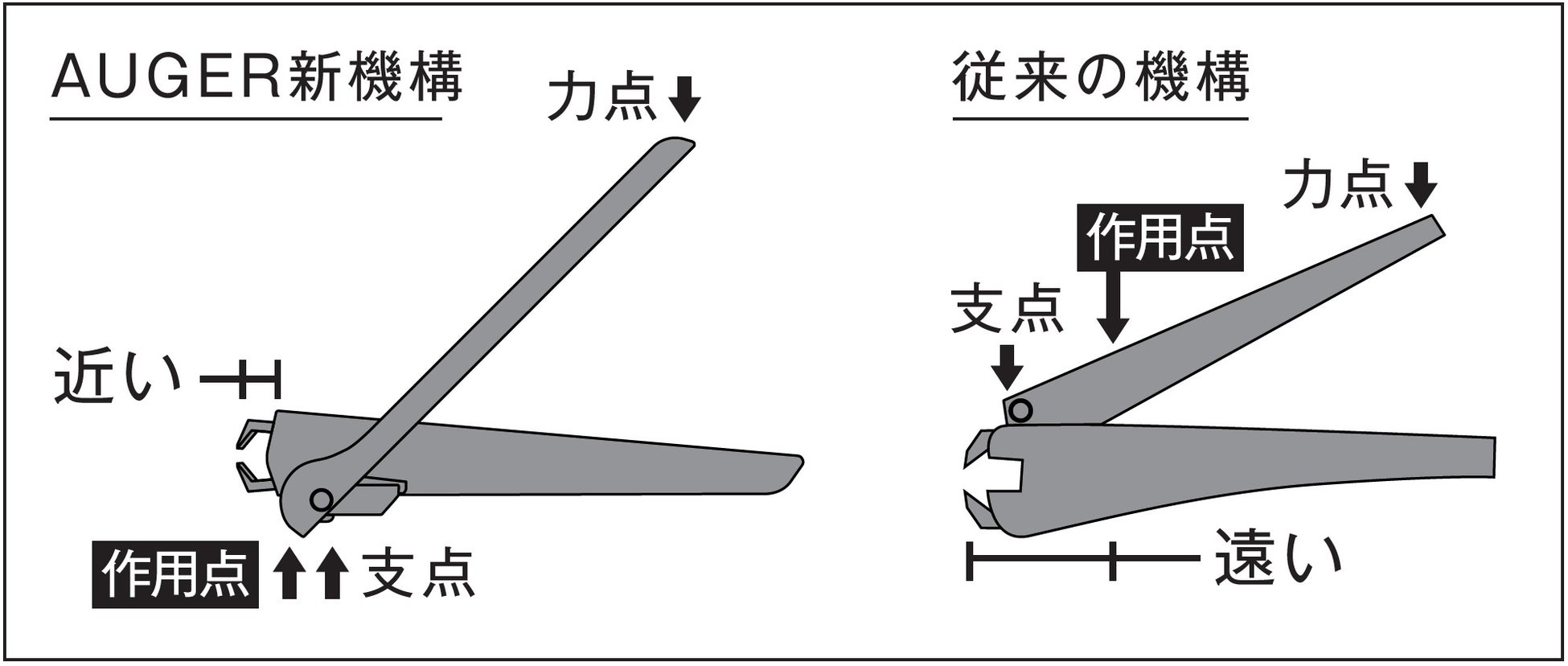 独自の旋回式レバー※4(特許取得済)により、従来のツメキリと比べて刃のすぐ近くを押すため、力が伝わりやすく、硬い爪でも力をかけずに切ることができます。スタイリッシュかつコンパクトなフォルムを実現しました。