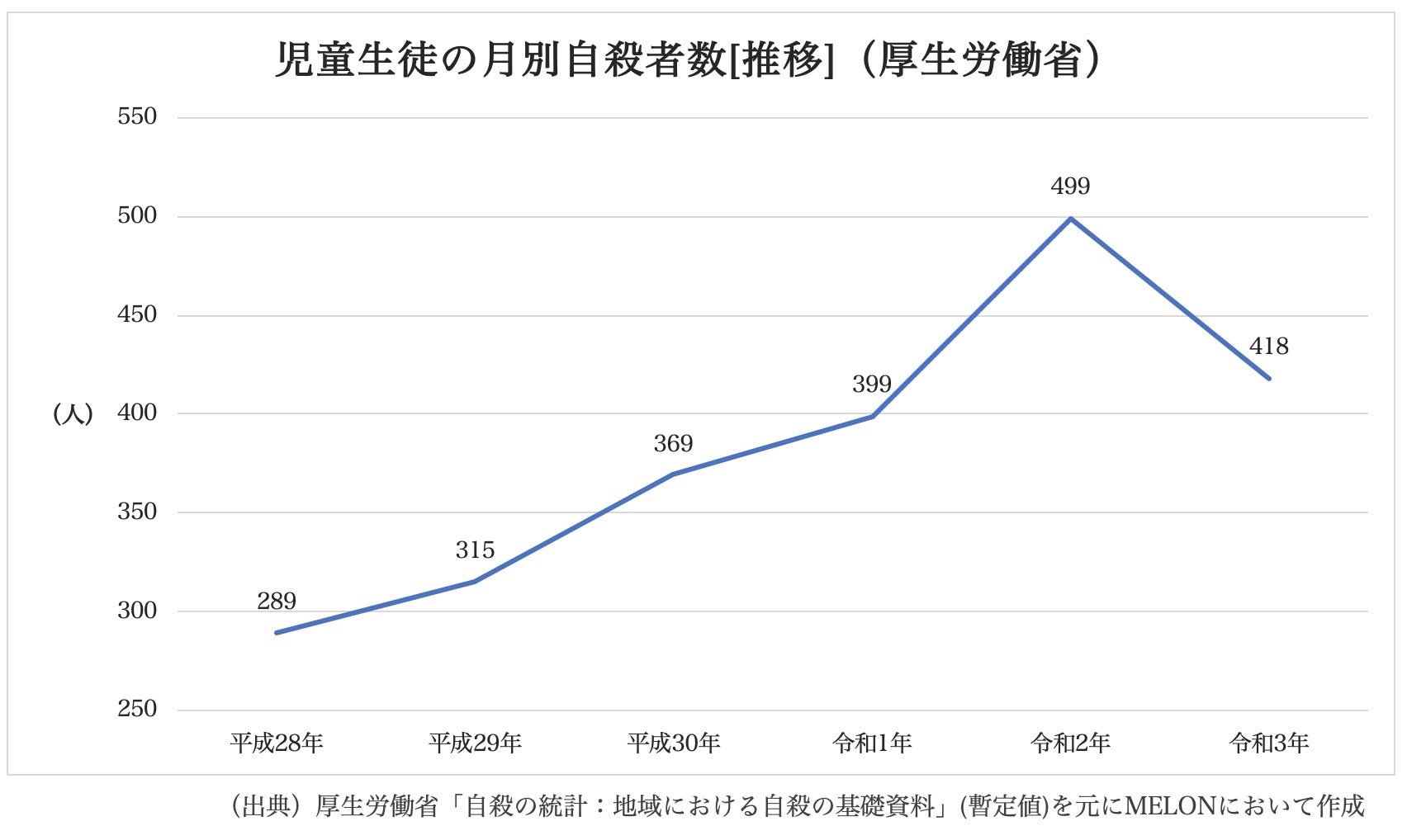 長期に渡るコロナ禍においては、子どもたちへのメンタル面での影響が危惧されており、積極的な心のケアをしていくことが社会的な課題になりつつあります。厚生労働省の調査によると令和3年(2021年)における児童生徒の自殺者数は418人で、過去最多となった令和2年(2020年)からは減少したものの、過去2番目に高い数字となっています。