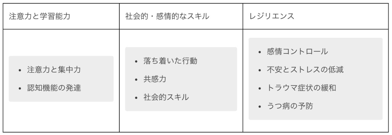 認知機能の改善、社会的・感情的なスキル、また幸福度という観点から、マインドフルネスを学ぶメリットがあると考えられています。それらは長期的に、子どもたちをより豊かな人生に導く上で役立つと考えられます。例えば、幼児期の社会的スキルのレベルは、成人期における教育、雇用、犯罪、薬物乱用、メンタルヘルスの状態との関連性が高いことが知られており、マインドフルネスを実践する子どもたちは以下のような能力を身に付けることが期待できます。