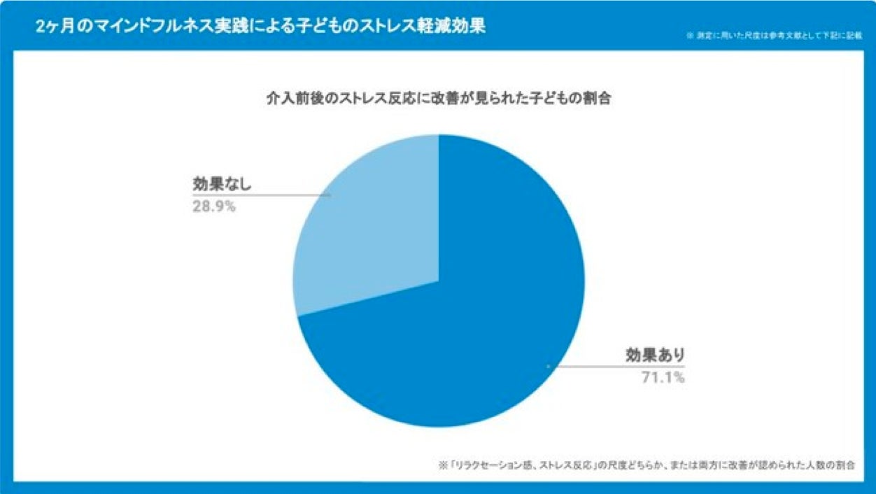本プロジェクトの検証により、マインドフルネスを2ヶ月継続することで、小学生においてもストレス解消効果がある可能性が統計的に実証されました。