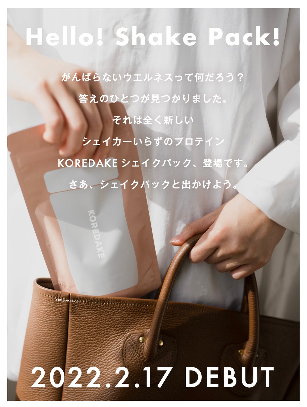 株式会社メップル(本社:東京都渋谷区 / 代表取締役CEO:鈴木 友樹)が展開する「わたしは、わたしらしく。」をコンセプトとした女性向けの植物性ウェルネスプロテイン『KOREDAKE』は、日本初となる “シェーカー不要” でそのまま美味しく飲むことができるプロテインとして、個包装タイプの新商品「シェイクパック」を本日2月17日より販売を開始いたします。