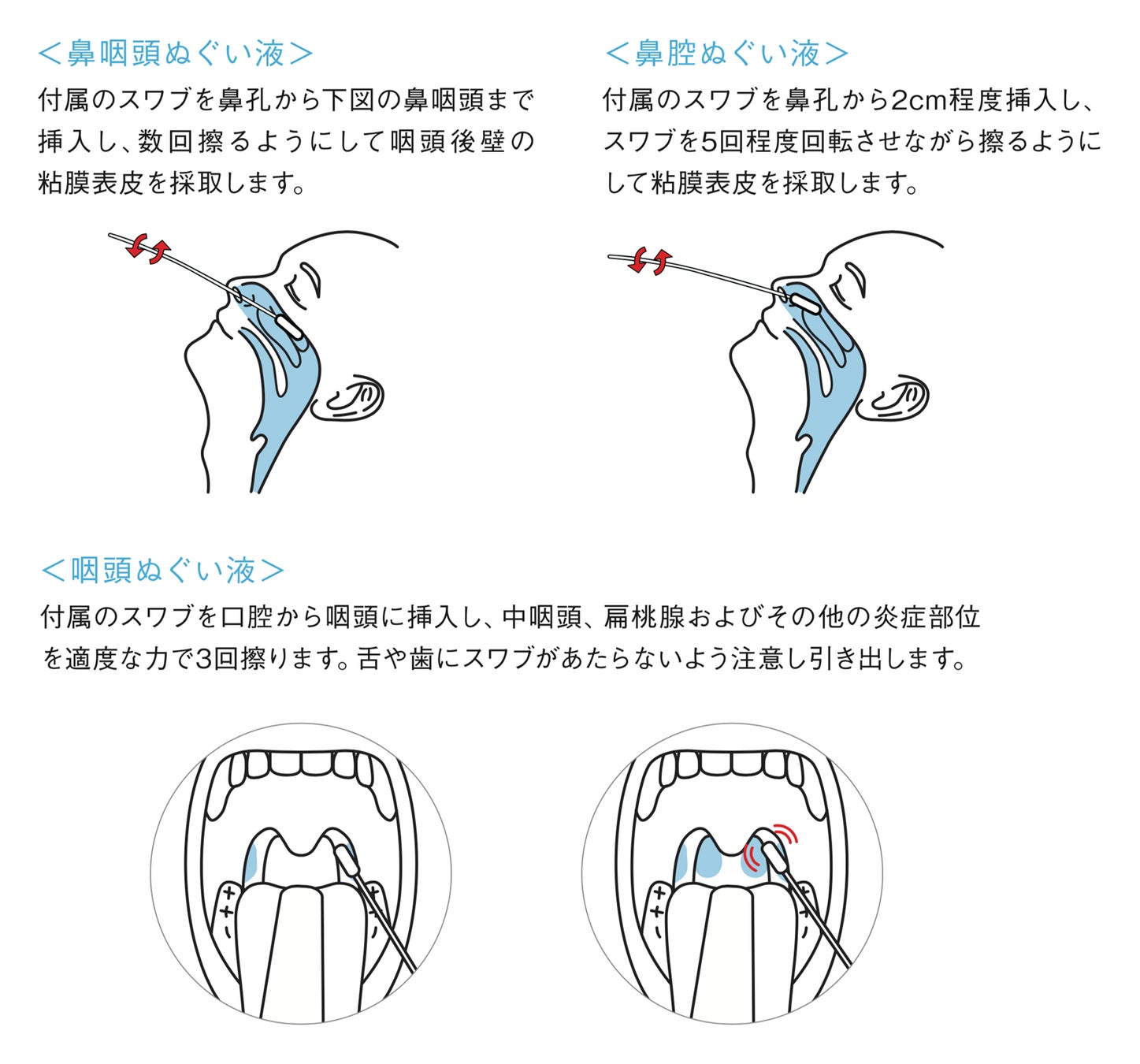 検体:鼻から2cm程度、綿棒を入れて採取(または喉奥から採取)