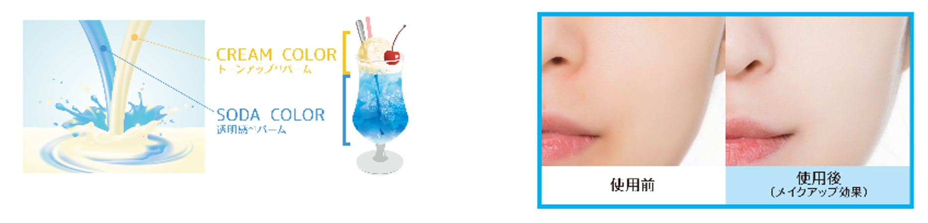 ソーダカラーの“透明感*1バーム”とクリームカラーの“トーンアップ*1バーム”が溶け合い、トーンアップ*1とカラーコントロールの効果を発揮します。韓国アイドルのような儚げで透明感*1溢れる仕上がりが叶います。