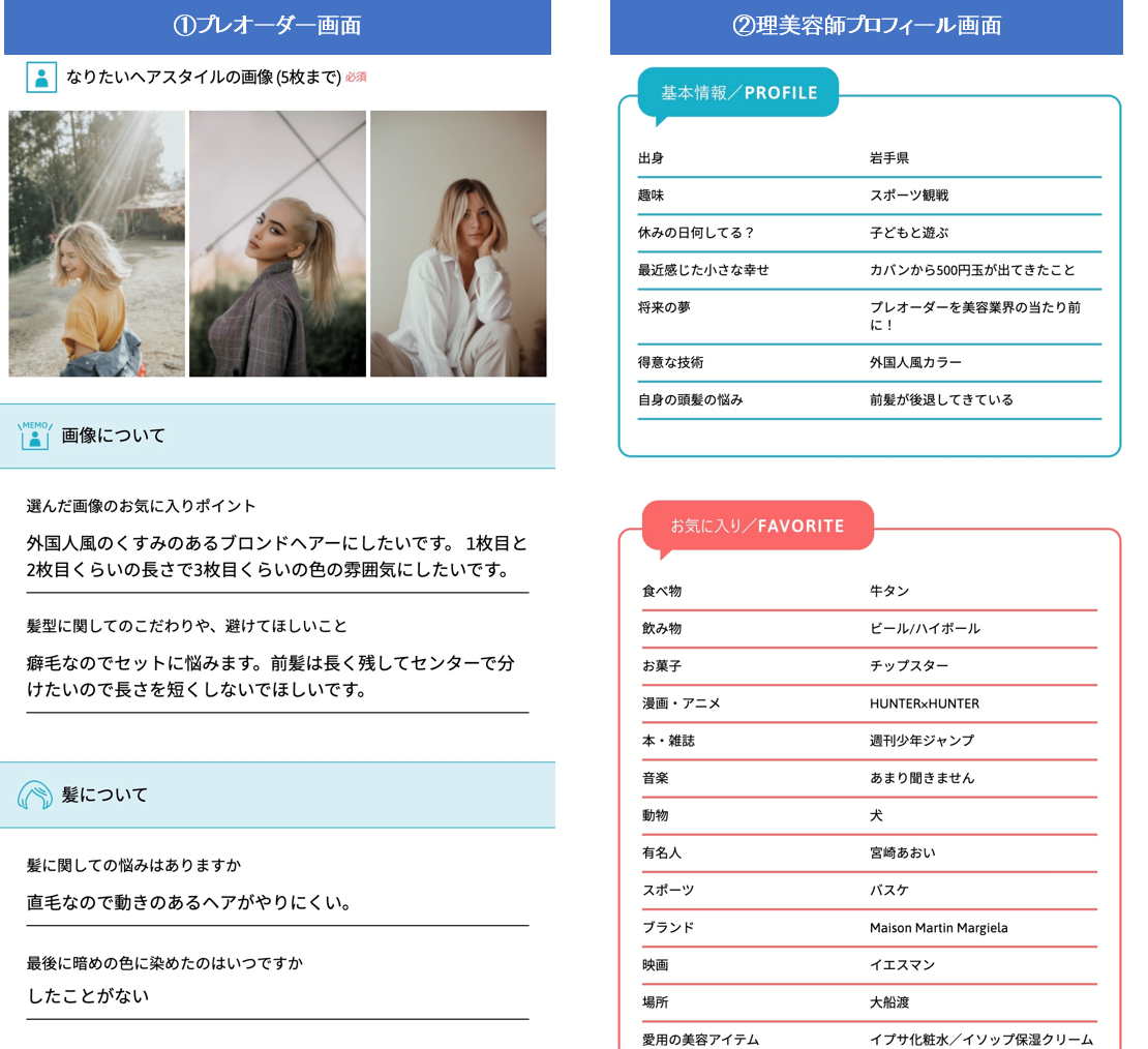 お客様と理美容師の「相互理解」を生むことで、ヘアサロンでの体験の満足度を高めることをコンセプトに、2つの機能を提供する、新WEBサービスです。