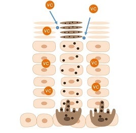 肌表面にうるおいを与え、ビタミンCの浸透をサポートする乳化成分は、一般的にビタミンCを肌深くへ届けにくい性質をもっています。そこで、乳化成分をビタミンCとともに高圧処理技術を施し、約10分の1サイズまで微細化しました。微細化された乳化成分がビタミンCの浸透をサポートし、有効成分を深くまで届けやすくすることが期待されます。