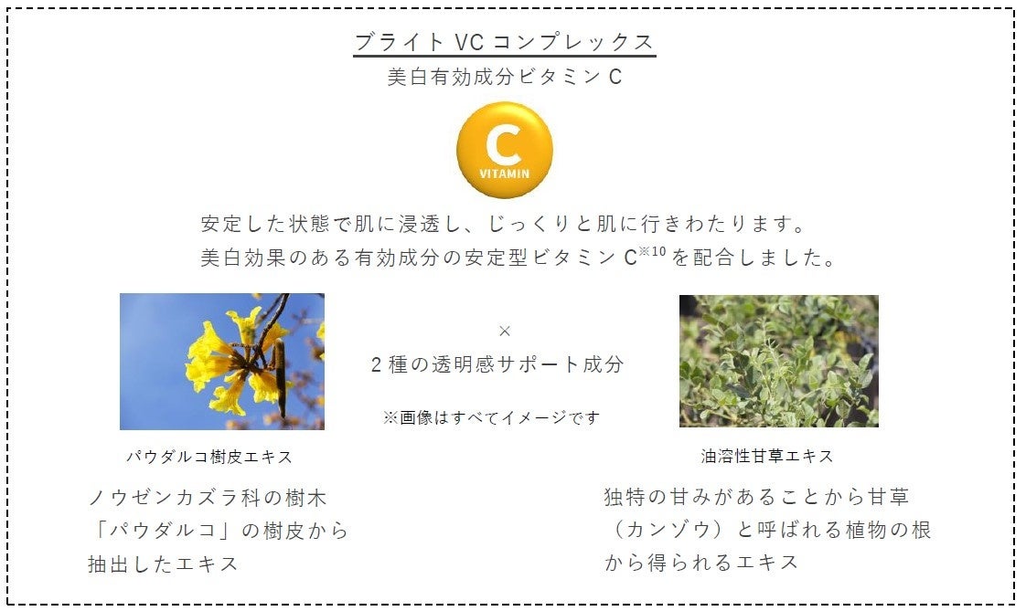 美白効果のある有効成分の安定型ビタミンCを配合することで肌※9で持続的に働き、じっくりと肌に行きわたることで浸透していきます。さらに、2種の透明感サポート成分を配合。