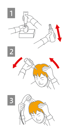 ⑴2剤容器を箱に固定して、1剤を全量加えてからキャップをしっかりと閉めて、30回程度上下に強く振って混ぜてください。
