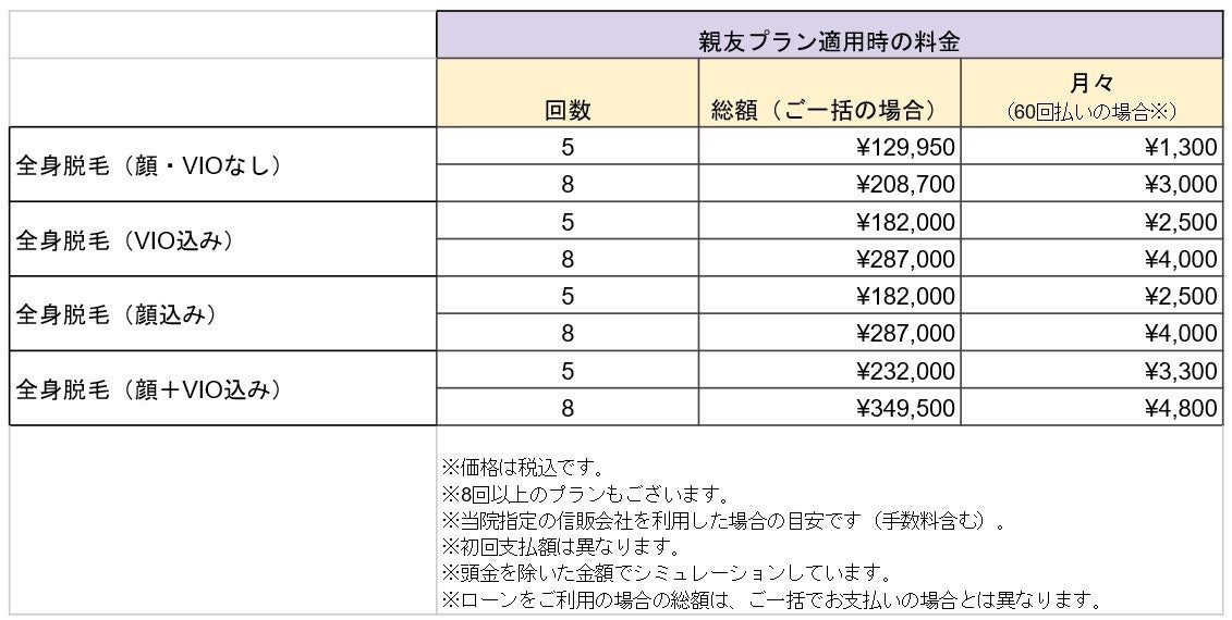 親友プランは、友達や家族など大切な人と二人で医療脱毛全身コースを始めていただくと、特別メニューで施術を受けていただけます。