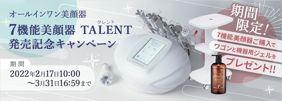 期間限定で7機能美顔器 TALENT(タレント)をご購入いただいた方に、ワゴンと機器用ジェルをプレゼント!
