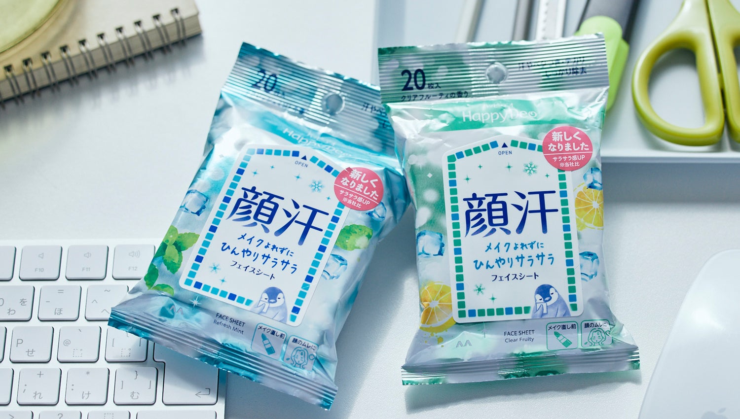 そこで、ポジティブにエチケットケアを楽しめる「マンダム ハッピーデオ」からシートタイプの顔汗ケアアイテム「マンダム ハッピーデオ フェイスシート」をリニューアル発売します。今回、新処方によりベタつきやテカリの除去力がアップし、サラサラな清潔肌に仕上がります。さらに新たな保湿成分※1を配合したことで、使用後の肌がつっぱらず、うるおいもキープします。