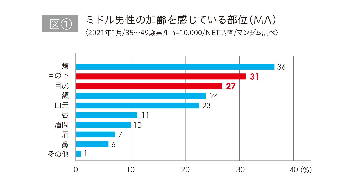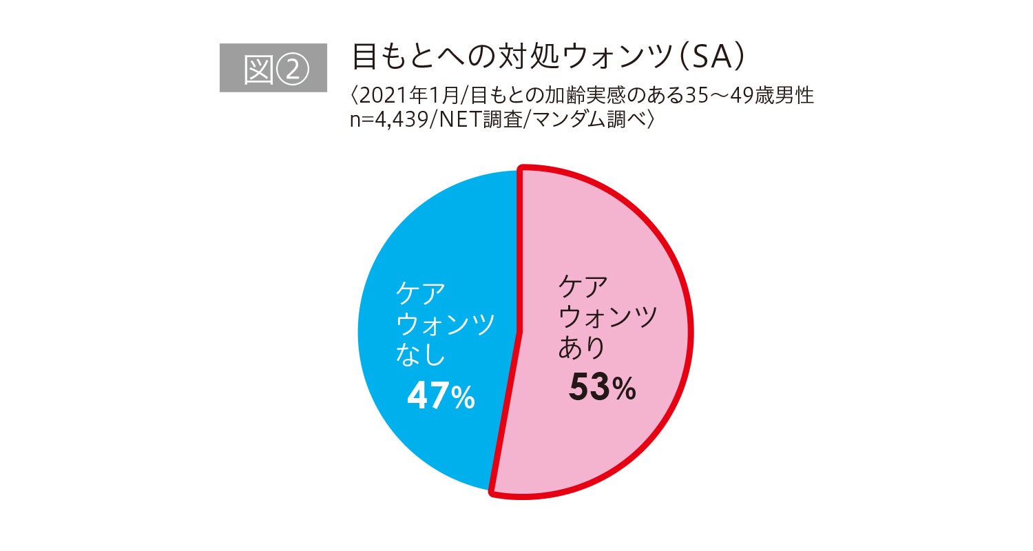 男性の身だしなみ意識が高まる中、男性スキンケア市場は、4年連続で拡大しています※3。コロナ禍による外出自粛で人と対面する機会が減っている中でも市場は伸長しており、男性の肌に対する意識の高まりがみられます。また、マスク生活により目もとを意識する機会が増えたことも影響してか、加齢を感じている部位として「目の下」や「目尻」を上位にあげているミドル男性が多くいます(図①)。その約半数はケアをしたいと考えています(図②)が、日常使いしているスキンケアを重点的に目もとにつけたり、軽くマッサージしたりと、普段のスキンケアの延長線上に留まり、目もとケアの効果に満足できていません。