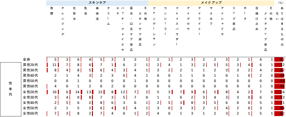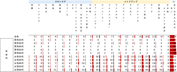 一方、スキンケア商品は大きな減少が見られず、男女ともに若年層において「化粧水」「乳液」「美容液」「洗顔」「パック」の購入金額が増加した。マスク生活で「肌荒れ」などの悩みが増加しており、スキンケアへの投資が増えているとみられる。