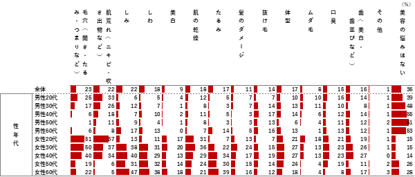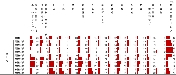 ▼性年代別の現在の美容の悩み