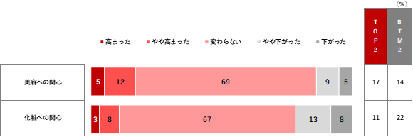 マスク生活が続く中、化粧への関心は低くなり、美容に関する関心は上昇