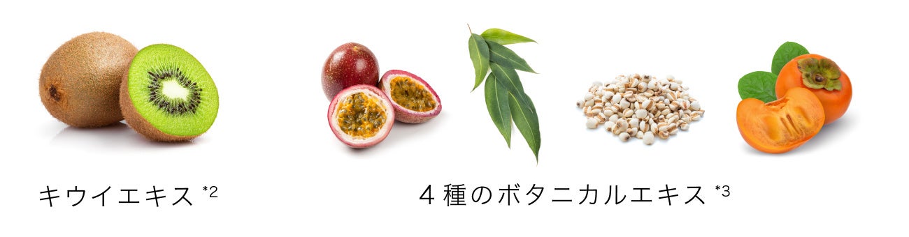 肌にしっとりつややかなうるおいを与えるキウイエキス*2や、美肌へ導く4種のボタニカルエキス*3配合。