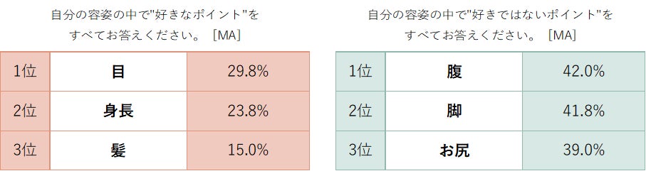 自分の容姿の中で好きなポイントを聞いたところ、1位「目」2位「身長」3位「髪」となりました。また、自分の容姿の中で好きではないポイントに関しては、1位「腹」2位「脚」3位「お尻」を選ぶ人が多いことがわかりました。