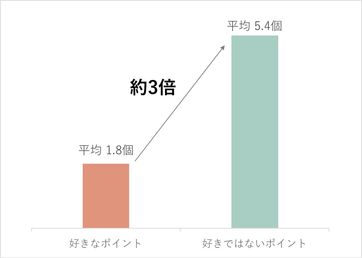 | 自分の容姿の中で「好きなポイント」は一人当たりの選ぶ数が平均1.8個。 一方で「好きではないポイント」は平均5.4個と、選ばれる数が3倍に。  |