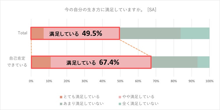 | 「自分自身の容姿について、固定観念に縛られず、肯定することが出来ている」と回答した中で、 「今の自分の生き方に満足している」と回答した人は67.4%。 全体の数値よりも20%近く上回る結果に。  |