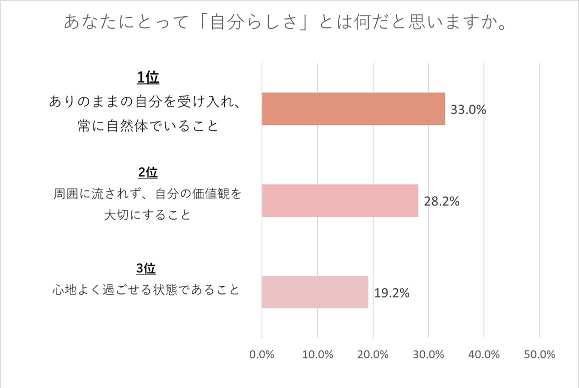 「自分らしさを見つけたい」と思っている人は61.3%。10~20代は77%と、特に多くなりました。「自分らしさとは何か」という質問に対しては、「ありのままの自分を受け入れ、常に自然体でいること(33.0%)」「周囲に流されず、自分の価値観を大切にすること(28.2%)」「心地よく過ごせる状態であること(19.2%)」という回答がTOP3となり、「自分らしく生きたい」と思う人は9割近くにのぼりました。これらの結果から、多くの女性が“年齢・性別・外見などの固定観念によって自身を判断し、合わせていくのではなく、自分を受け入れ、自身の価値観を大切にして生きていきたい”という思いを抱いていることが推測されます。