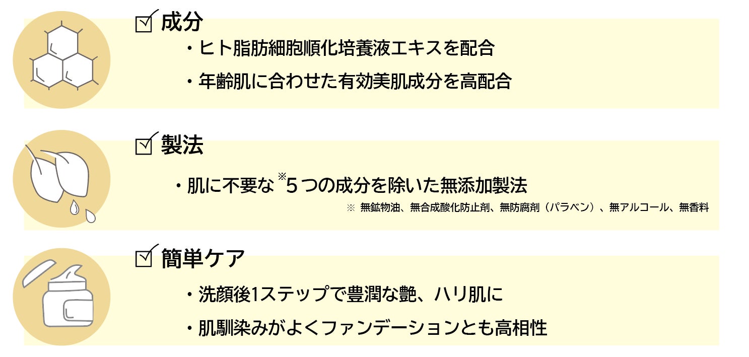 “成⻑因子”はヒト脂肪細胞順化培養液エキスにたっぷり含まれており、“保湿成分”はヒアルロン酸、“メラニン抑制成分”はナイアシンアミドなど、美容成分も贅沢に配合しながら、朝晩のクイックなワンステップスキンケアとして使用できるオールインワンジェルタイプに仕上げました。