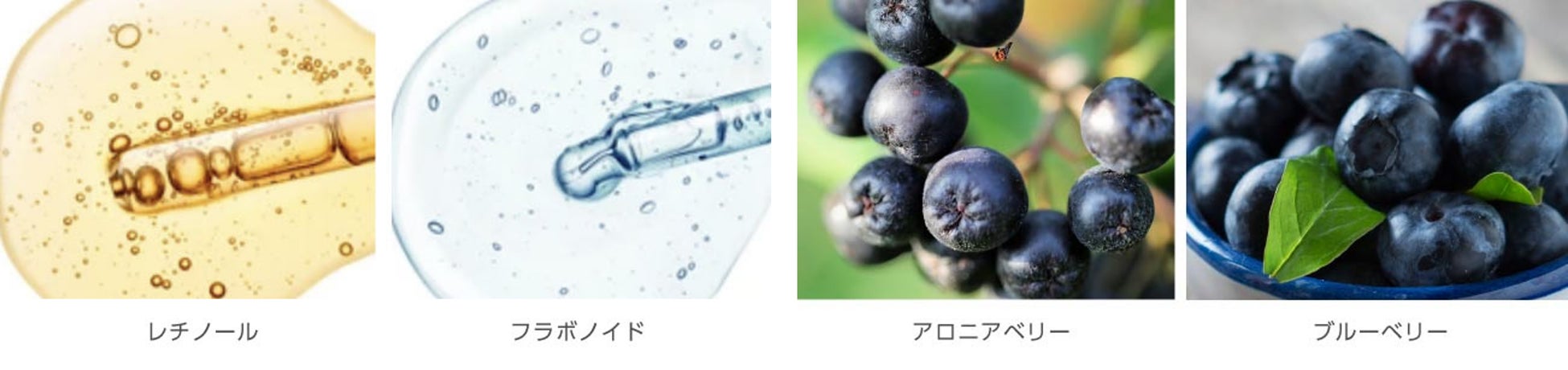 また、エイジングケア*7保湿成分としてレチノール、フラボノイドを配合。うるおい成分のアロニアエキス*8、ブルーベリーエキス*9配合しており、さらにうるおいあふれるツヤ感を与えます。
