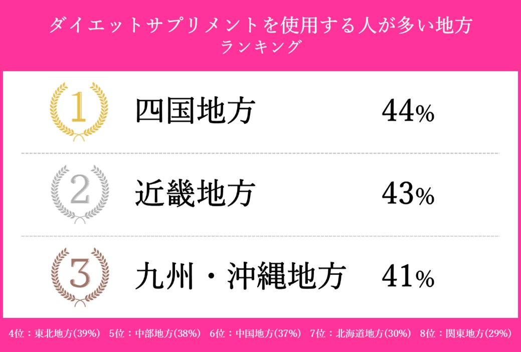ダイエットに取り組んでいるとき、サプリメントを使用したことがあるかの問いについては、3人に1人(37.6%)がサプリメントを使用したことがあると回答。その中でサプリを使用したことがある人が最も多い地方は「四国地方(44%)」だった。