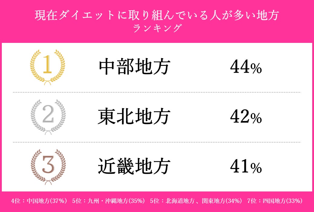 まず、現在ダイエットに取り組んでいるか否かを質問したところ、ダイエットに取り組んでいる人が最も多い地方は「中部地方(44%)」だった。一方で、ダイエットに取り組んでいる人が最も少ない地方は「四国地方(33%)」だった。