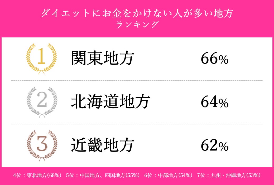 ダイエットにかける金額については、ダイエットにお金かけていた人が最も多い地方は、「九州・沖縄地方(1円以上使用した人の割合が47%)」。一方、最もお金をかけていなかったのは、「関東地方(1円も使わなかった人の割合が66%)」だった。実は、ダイエットに勝ち組地方「関東地方」の人々が、お金をかけずに痩せることができる「0円ダイエット地方」であることがわかった。