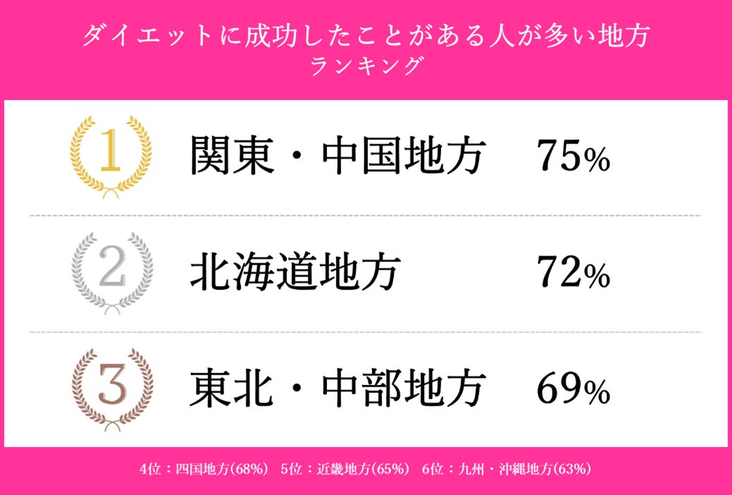 続いて、これまでダイエットに成功したことがあるかについては、ダイエットに成功したことある人が最も多い地方は「関東地方」「中国地方(75%)」だった。一方で、ダイエットに失敗したことが多い地方は「九州・沖縄地方(37%)」という結果となった。