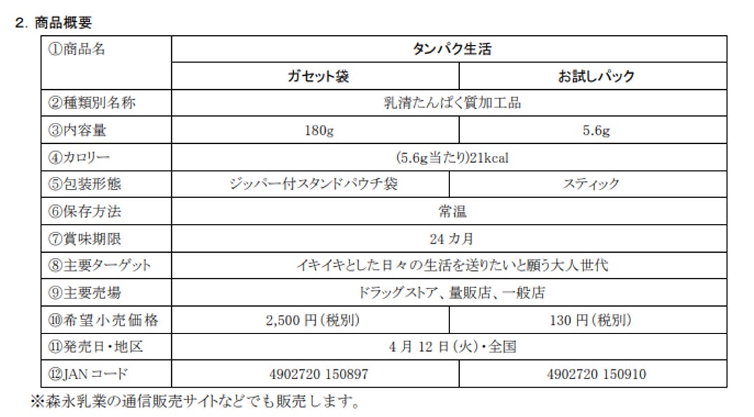 このような背景もあり、大人世代の方に健康でイキイキとした生活を送っていただきたいと、いつでも、どこでも、お好 みの飲み物や料理に使用できる、ほとんど無味無臭のプロテイン粉末「タンパク生活」を新発売します。日常生活の中 で無理なく手軽にたんぱく質を摂取いただけますので、ぜひこの機会にお試しください。