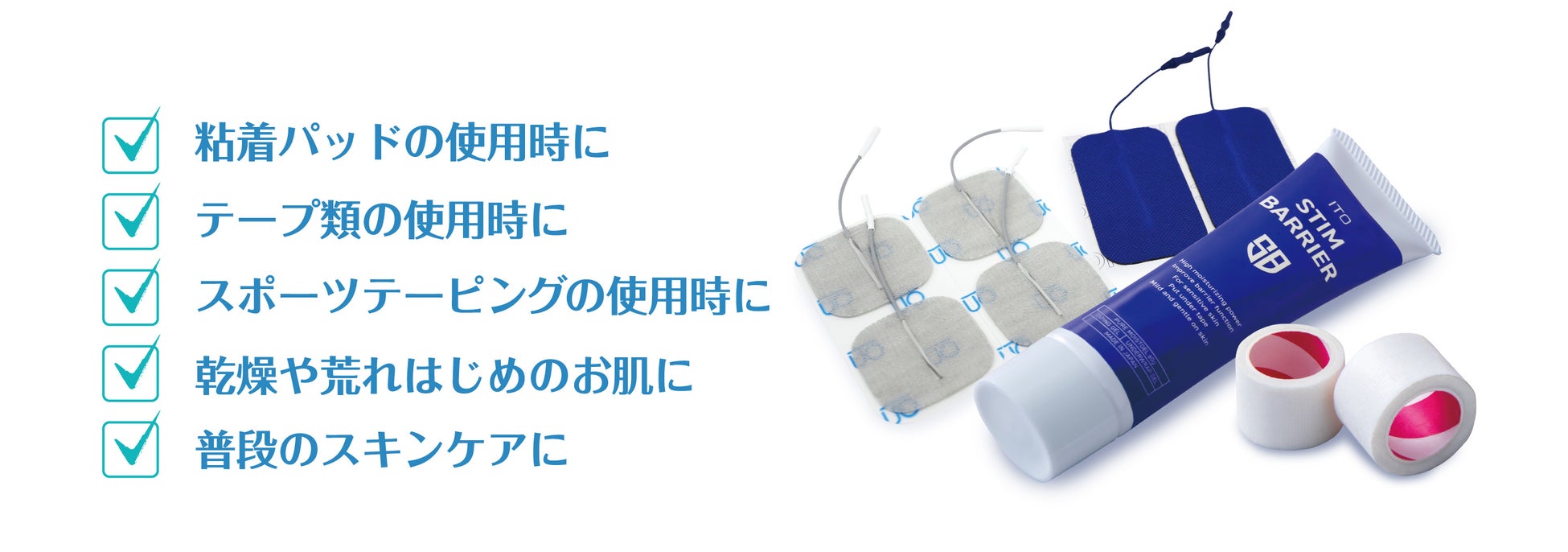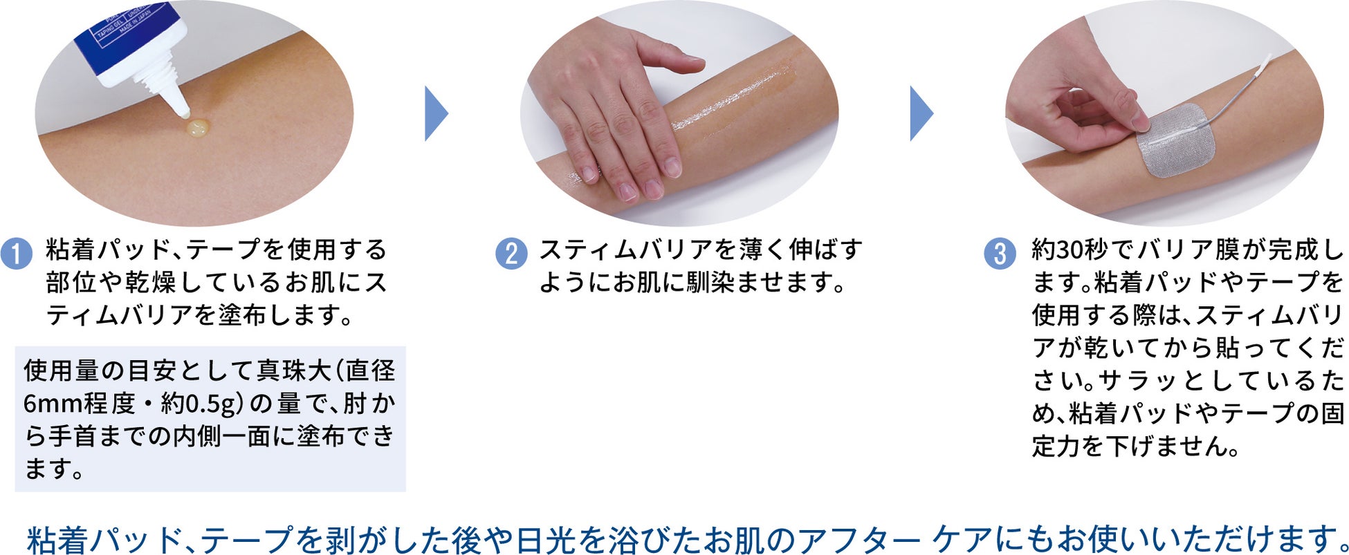 スティムバリアをお肌に馴染ませるように薄く広げて約30秒ほどでバリア膜ができます。スティムバリアが乾いてからテープを貼ってください。テープの固定力を下げないのもスティムバリアの特徴です。