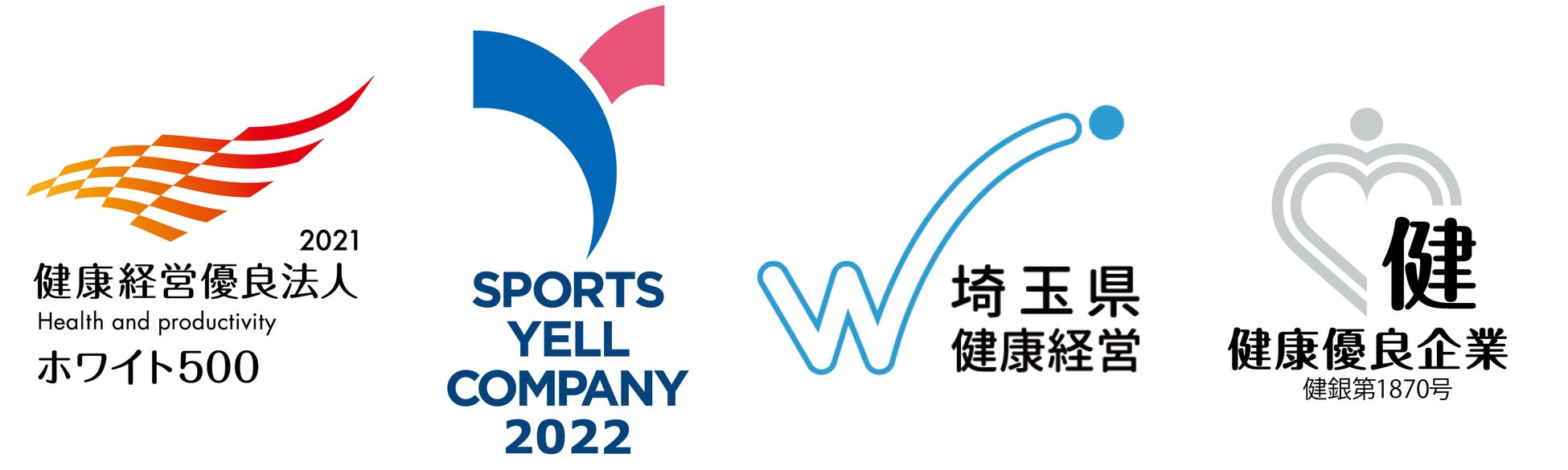 弊社の健康経営への取り組みに対する評価として、経済産業省と日本健康会議が共同で選出する「健康経営優良法人(大規模法人部門)」、スポーツ庁が認定する「スポーツエールカンパニー」、本社所在地である埼玉県が認定する「埼玉県健康経営実践事業所」、および健康保険組合連合会 東京連合会が認定する「健康優良企業「銀の認定」」を取得しています。