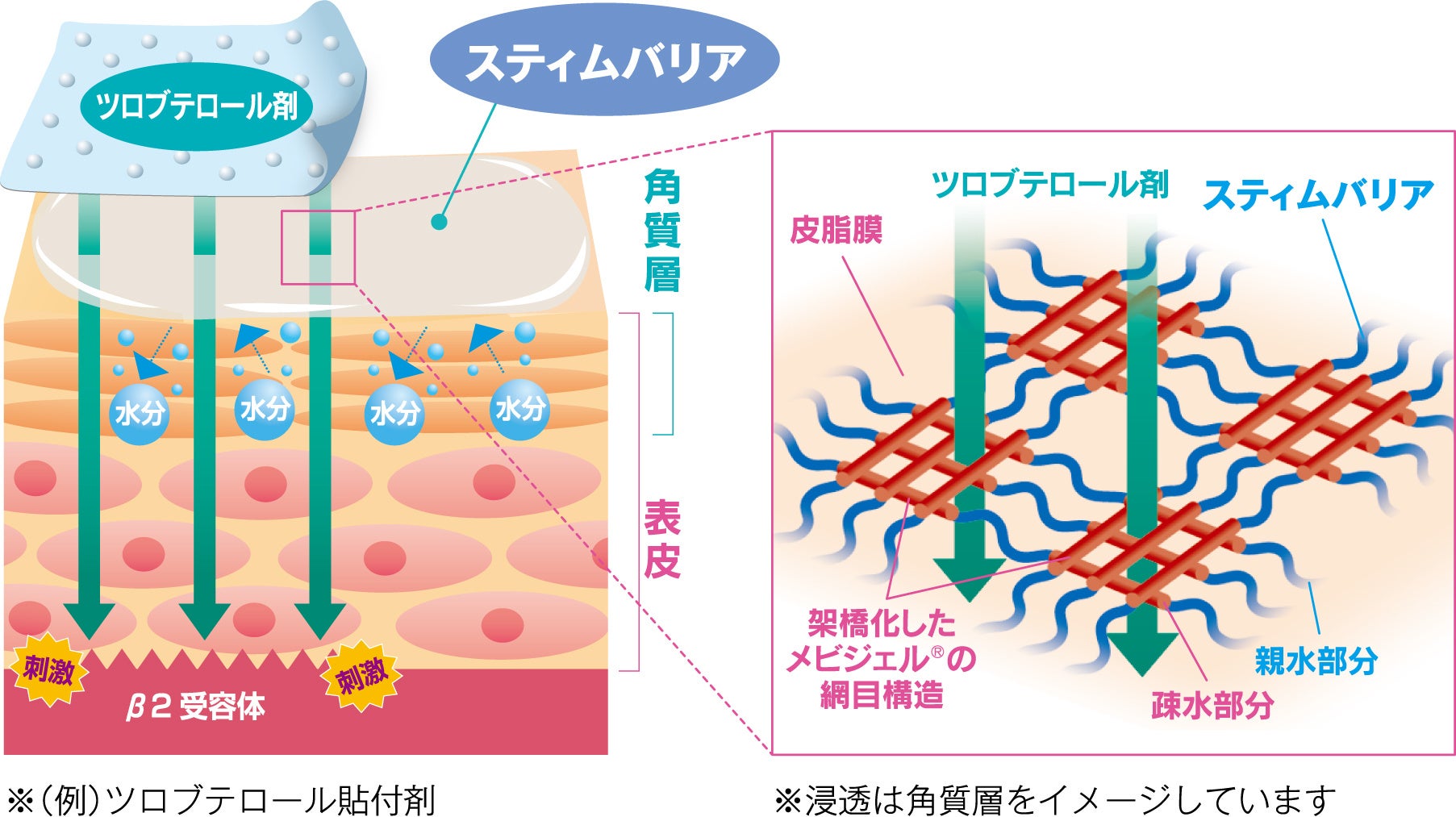温度感応性高分子クロスポリマーが、皮膚に薄いバリア膜を形成します。バリア膜があることで、お肌の水分が外に逃げないように潤いをキープします。また、テープなどを剥がす際の角質表皮剥離を軽減させます。