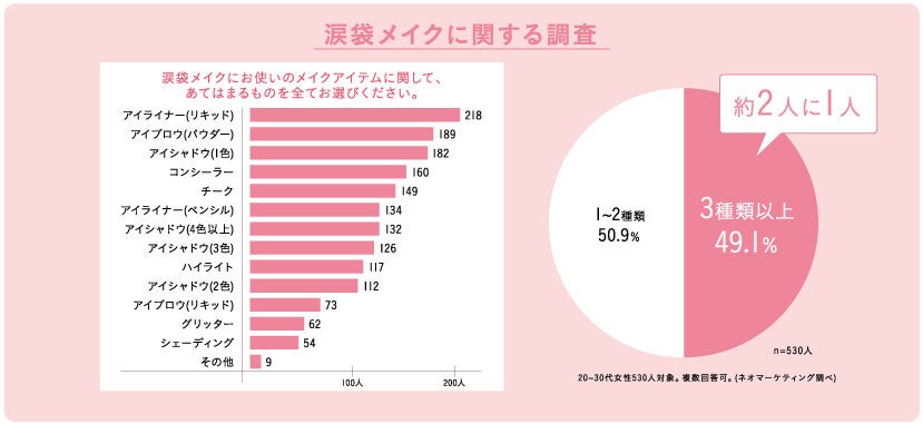 涙袋メイクとは、涙袋をよりふっくらと主張して魅せるようなメイク方法。ドーリーウインクはこの“涙袋メイク”に関する調査を実施しました。涙袋メイクを実践している方のうち約49%の方が、メイクアイテムを3種類以上使用しているという結果となり、多くのメイクアイテムと手間をかけて完成させていることがわかりました。そこで、 【DOLLY WINK】からより簡単にぷっくりした涙袋をつくることができるメイクアイテムを開発することになりました。