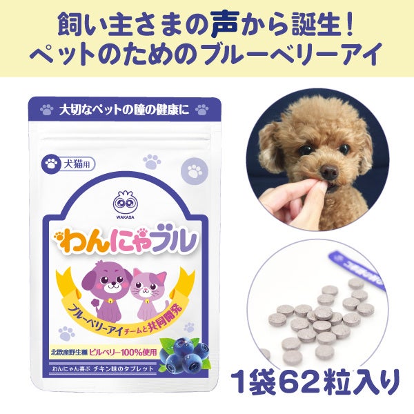 わんちゃん・ねこちゃんも人間と同じように歳を取ると、ひとみが濁ったり、涙や目やにがひどくなったりと、ひとみのお悩みも増えてきてしまいます。そんなお悩みを持つ飼い主さまから「愛犬・愛猫にも『ブルーベリーアイ』を飲ませたい」という声をいただいたことがきっかけで、わかさ生活から初のペット用アイケアサプリ『わんにゃブル』が誕生しました。