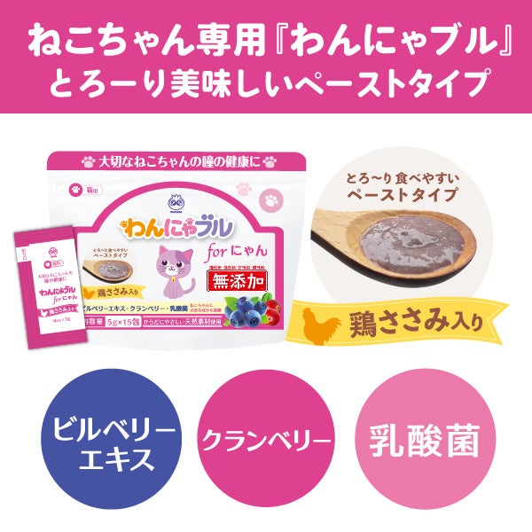 『わんにゃブル』が誕生して5年。よりねこちゃんの健康を考えた成分を配合し、おいしいペーストタイプにしたねこちゃん専用の『わんにゃブル』が、『わんにゃブルforにゃん』です。
